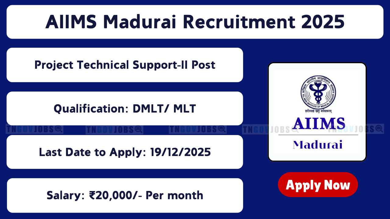 AIIMS Madurai Recruitment 2025: All India Institute of Medical Sciences (AIIMS) Madurai invites online applications for 1 Project Technical Support-II post on contractual basis. Eligible candidates can apply before 19-12-2025 .