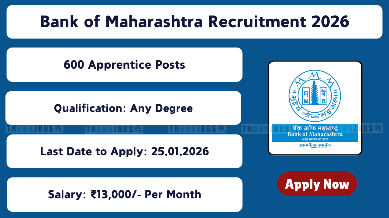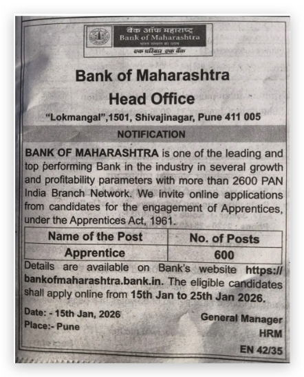 Bank of Maharashtra Apprentice Recruitment 2026: Bank of Maharashtra invites applications for 600 Apprentice Posts. Apply Online from 15-01-2026 to 25-01-2026. No exam fee for reserved categories!