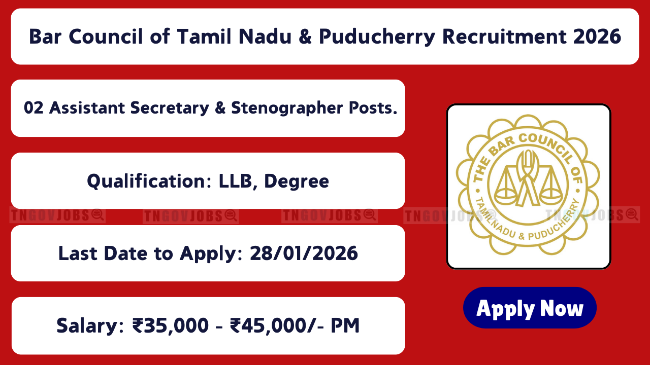 Bar Council of Tamil Nadu & Puducherry Recruitment 2026: Bar Council of Tamil Nadu and Puducherry has released notification for 02 Assistant Secretary & Stenographer Posts. Apply Offline before 28-01-2026. No Application Fee!
