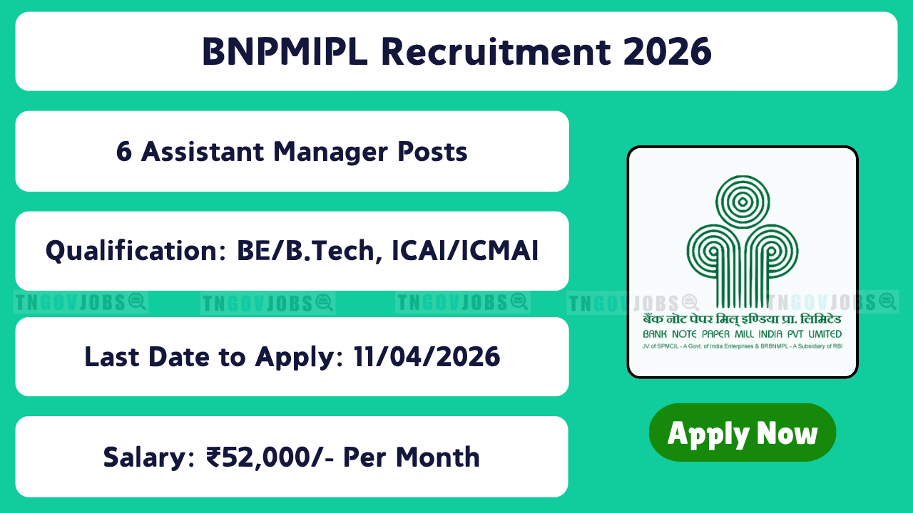 Bank Note Paper Mill India Pvt. Ltd. (BNPMIPL) Recruitment Notification No: 02/2026 DTD.06.03.2026 is released! Apply offline for 6 Assistant Manager vacancies – Finance & Accounts (2), Materials Management (2), Civil (2) at Mysuru, Karnataka. Last date for receipt of filled application: 11 April 2026 (17:00 hrs). Qualification: B.Com/BBA + CA/CMA OR B.E/B.Tech (Mechanical/Electrical/Electronics) OR Civil Engineering (post-wise). Experience: Not essential. Age: 32 years (relaxations apply). Pay: Level 8 (₹52,000). Selection through Offline/Online Test + Personal Interview. Application fee ₹800 (others), Nil (reserved). Full eligibility & apply process below.