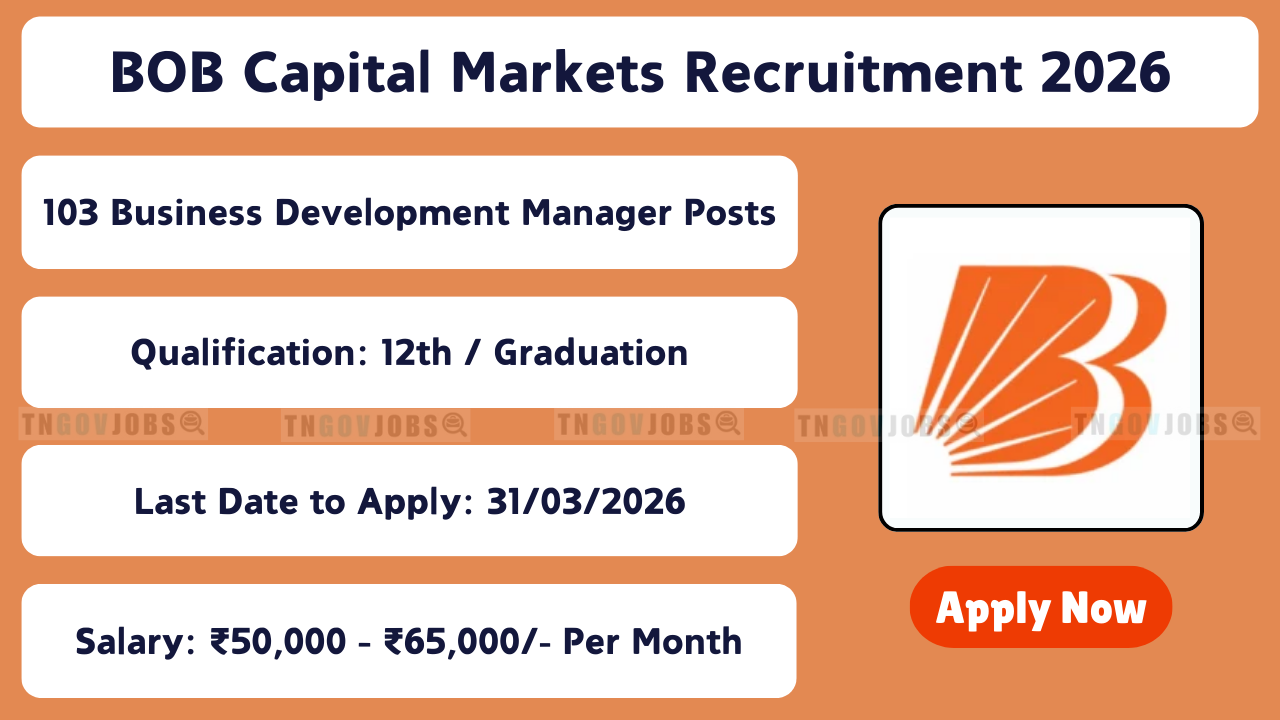 BOB Capital Markets Limited Recruitment 2026 invites applications for 103 Business Development Manager vacancies across All India. Last date to send application by email: 31 March 2026. Qualification: 12th / Graduation / Post Graduation (post-wise). Age: Not specified (as per norms). Salary: As per industry norms. Selection through Interview. No application fee. Full eligibility & apply process below.
