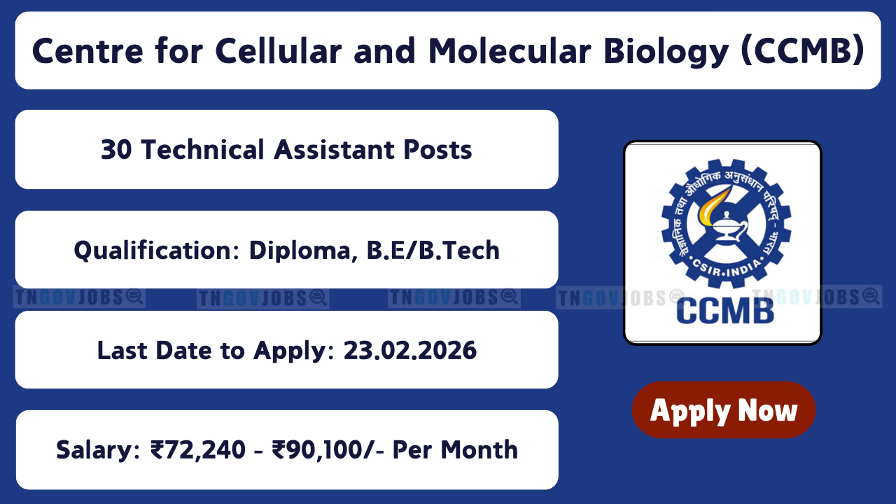 CSIR-Centre for Cellular and Molecular Biology (CCMB), Hyderabad Recruitment 2026 Notification No: 02/2026 is released! Apply online for 30 Technical Assistant & Technical Officer vacancies in Hyderabad. Online registration from 27 January 2026 to 23 February 2026 at ccmb.res.in. Hard copy submission by 02 March 2026 (06:00 PM). Qualification: B.Sc. / Diploma / M.Sc. with experience. Age: 28–30 years (relaxations apply). Pay: ₹72,240 / ₹90,100. Application fee ₹500 / Nil (reserved). Full eligibility, posts, age, salary & apply process below.