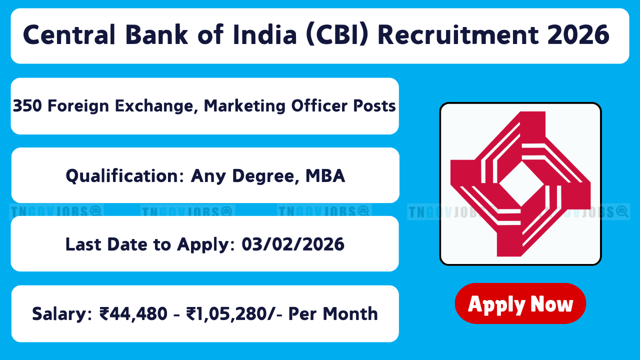 Central Bank of India (CBI) Recruitment 2026 Notification is released! Apply online for 350 Specialist Officer vacancies – Foreign Exchange Officer (Scale III – 50 posts) & Marketing Officer (Scale I – 300 posts). Online registration opens 20 January 2026 and closes 03 February 2026. Age limit: 22–35 years (relaxations apply). Pay scale up to ₹1,05,280/-. Online test + interview. Application fee ₹175–₹850. Full eligibility, age, salary & apply process below.