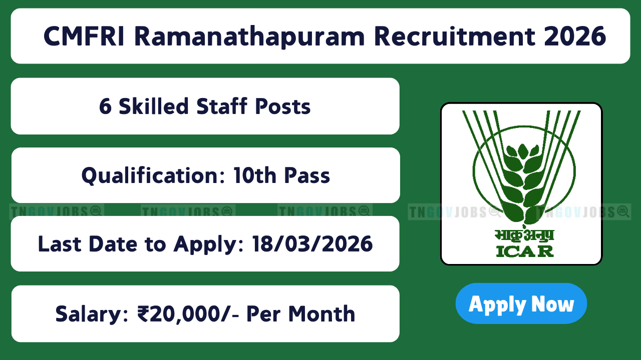 Central Marine Fisheries Research Institute (CMFRI) Ramanathapuram Recruitment 2026 invites applications for 6 Skilled Staff vacancies on contractual basis. Walk-in-Interview date: 18 March 2026. Qualification: 10th Pass or equivalent. Age: 21–45 years. Salary: ₹20,000 per month (consolidated). Selection through Walk-in-Interview. No application fee. Full eligibility & apply process below.