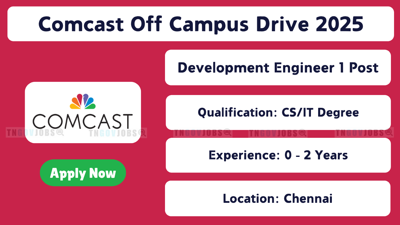 Comcast Recruitment 2025: Comcast has released the recruitment notification for Development Engineer 1 post (Req ID: R424778). This is a full-time permanent role at Chennai, India. Freshers with B.E/B.Tech in CS/IT (0–2 years exp) are eligible. Apply online before 11-12-2025 through the official Comcast Jobs portal.