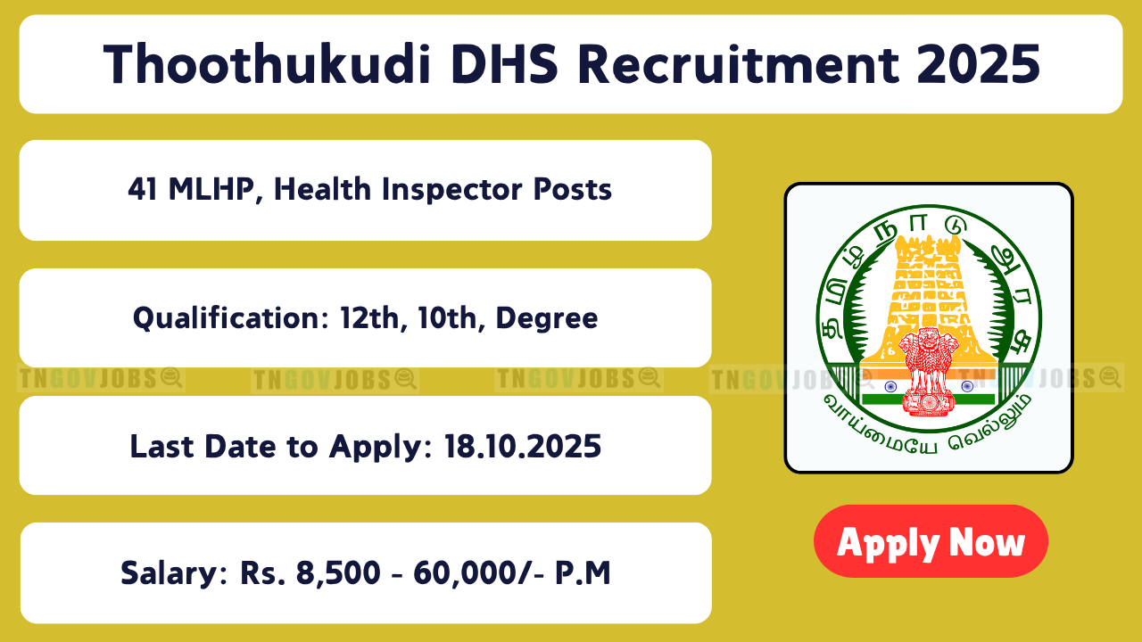 DHS Thoothukudi Recruitment 2025: District Health Society Thoothukudi (DHS Thoothukudi) has released a notification for the recruitment of 41 posts including Medical Officer, Account Assistant, and others in Thoothukudi, Tamil Nadu. Interested candidates can apply offline by submitting the application form to the specified address by 18-10-2025. Candidates must carefully read the DHS Thoothukudi 2025 notification and verify their eligibility before applying. Check the official notification for salary and additional benefits like medical insurance, PF, TA/DA, etc. Applicants must maintain a working Email Address and Mobile Number until the DHS Thoothukudi Recruitment 2025 results are announced.