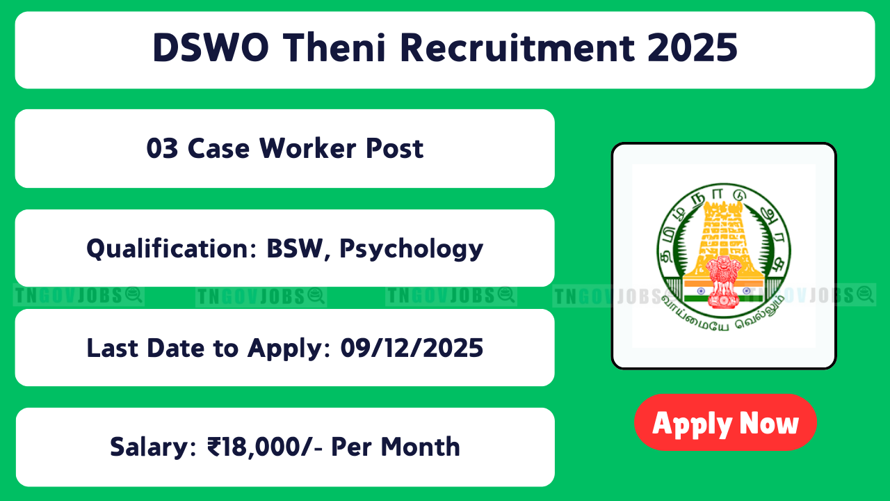 DSWO Theni Recruitment 2025: District Social Welfare Office Theni has released notification for 03 Case Worker Posts (One Stop Centre). Apply Offline + Email before 09-12-2025. No Application Fee!