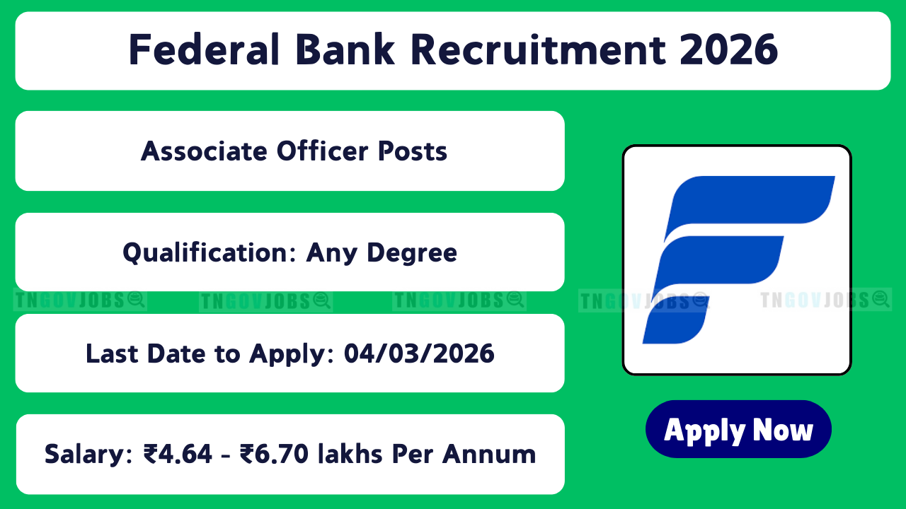 Federal Bank Recruitment 2026 is released! Apply online for Associate Officer (Sales) vacancies. Online registration from 20 February 2026 to 04 March 2026 at federal.bank.in/careers. Qualification: Any Graduation. Age: Maximum 27 years (born on or after 01.02.1999). CTC: ₹4.64 – ₹6.70 Lakhs per annum. Selection through Group Discussion + Aptitude Test + Personal Interview. No application fee. Full eligibility & apply process below.