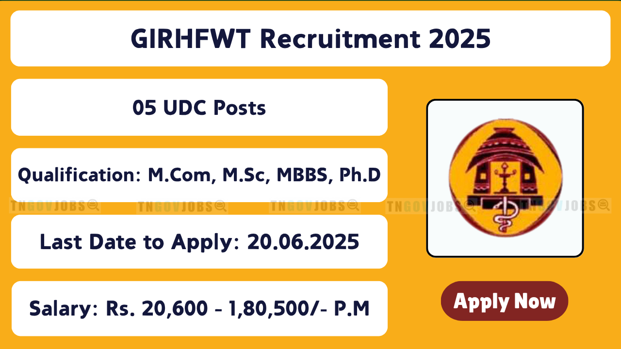 GIRH&FWT Dindigul Recruitment 2025: The Gandhigram Institute of Rural Health and Family Welfare Trust (GIRH&FWT), Dindigul, has released Notification No: GIRH/ESTT/01/CTI-15/2025-2026 dated 25.05.2025 at girhfwt.org for the recruitment of 5 Medical Lecturer – Demonstrator, Teaching Assistant / Lecturer in Bio Statistics, Senior Sanitarian Officer / Statistical Officer, and Upper Division Clerk / Junior Accountant posts on a regular basis. Eligible candidates can apply offline by submitting applications to the Director by 20.06.2025 at 5:00 PM to contribute to rural health and family welfare initiatives in Tamil Nadu.