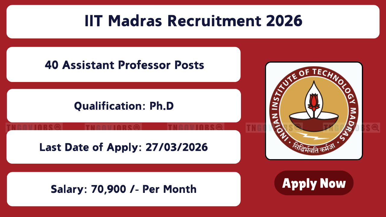 Indian Institute of Technology Madras Recruitment Notification No: IITM/R/1/2026 Dated 27.02.2026 is released! Apply online for 40 Assistant Professor vacancies – Grade II & Grade I across 18 departments. Online registration from 27 February 2026 to 27 March 2026 at facapp.iitm.ac.in. Qualification: Ph.D. with first class or equivalent at preceding degree + strong academic record (experience required for Grade I). Age: 36 years (relaxations apply). Pay: Level 10 (Grade II) & Level 12 (Grade I). Selection through Shortlisting + Personal Interview. Full eligibility & apply process below.
