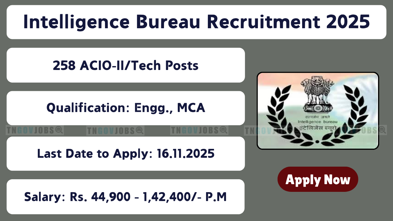 Intelligence Bureau ACIO-II/Tech Recruitment 2025: The Intelligence Bureau (IB) has released a notification to fill 258 Assistant Central Intelligence Officer Grade-II/Tech (ACIO-II/Tech) posts. Eligible candidates can apply online through the official website www.mha.gov.in from 25-10-2025 to 16-11-2025. Candidates must carefully read the IB ACIO-II/Tech 2025 notification and verify their eligibility before applying. Check the IB Notification 2025 for salary and additional benefits like medical insurance, PF, TA/DA, etc. Applicants must maintain a working Email Address and Mobile Number until the IB Recruitment 2025 results are announced.