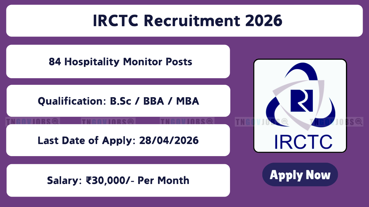 Indian Railway Catering and Tourism Corporation (IRCTC) invites applications for **84 Hospitality Monitor** posts on a fixed-term contract basis in **Tamil Nadu, Kerala, and Karnataka**. Interested and eligible candidates can attend the **Walk-in Interview** on **25th, 27th & 28th April 2026** at Chennai. This is a good opportunity for Hospitality / Hotel Management graduates.