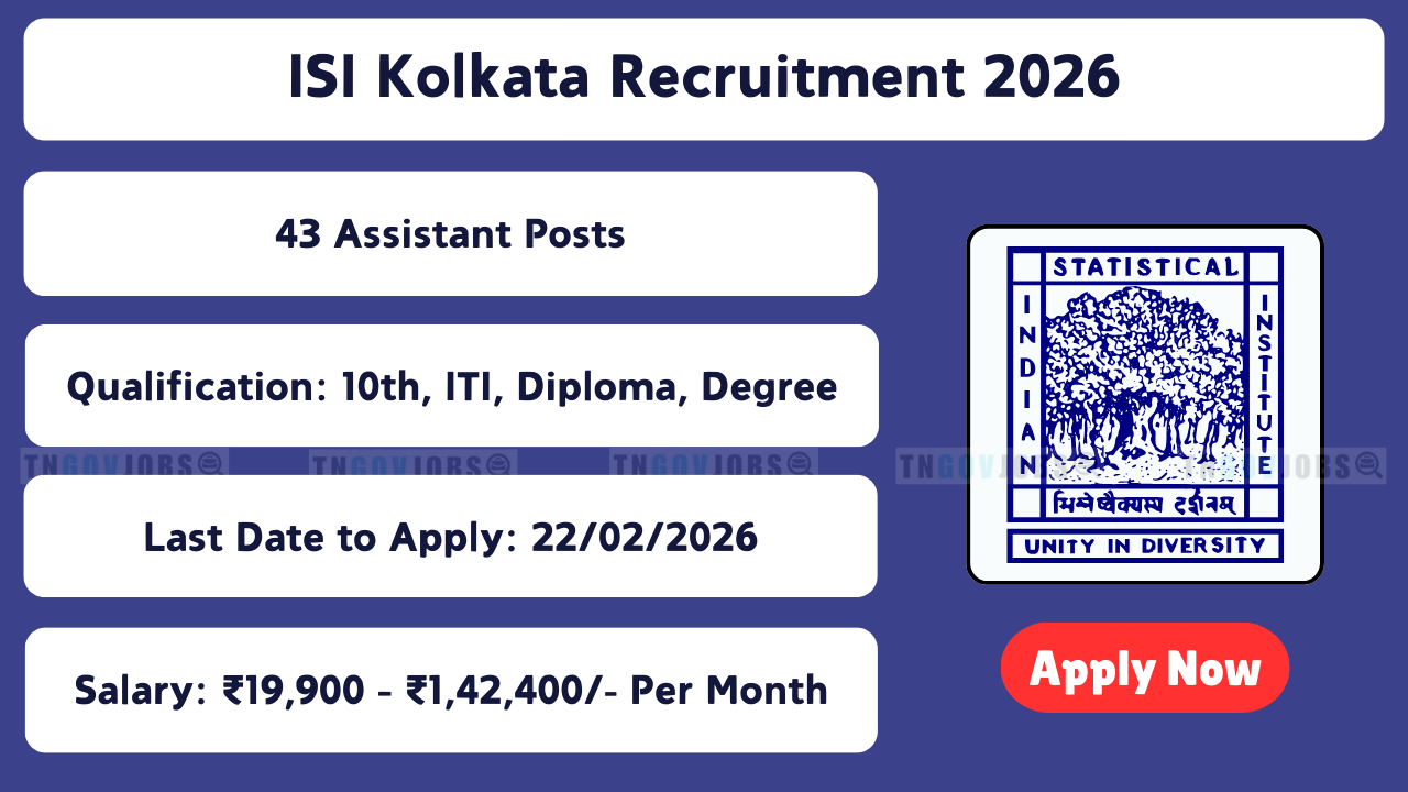Indian Statistical Institute (ISI) Kolkata Recruitment 2026 Notification No: REC-01/2026-1, KOL is released! Apply online for 43 regular vacancies – Associate Scientist ‘A’ (4), Section Officer (Accounts) (3), Section Officer (General) (10), Scientific Assistant ‘A’/Library ‘A’ (6), Engineering Assistant (Civil) ‘A’ (1), Assistant (Laboratory) ‘A’ (1), Carpenter ‘A’ (1), Electrician ‘A’ (4), Pharmacist ‘A’ (1), Driver ‘A’ (2), Binder ‘A’ (1), Operator-Mechanic (Audio-Visual) ‘A’ (1), Assistant (Printing) ‘A’ (1), Assistant (Library) ‘A’ (4), Operator-Mechanic (Lift) ‘A’ (1), Cook ‘A’ (2). Online facility from 24 January 2026 to 22 February 2026 at web.isical.ac.in. Salary up to Level-7 (₹44,900–1,42,400). Age up to 40 years. Application fee ₹250–₹500. Full eligibility, age, salary & apply process below.