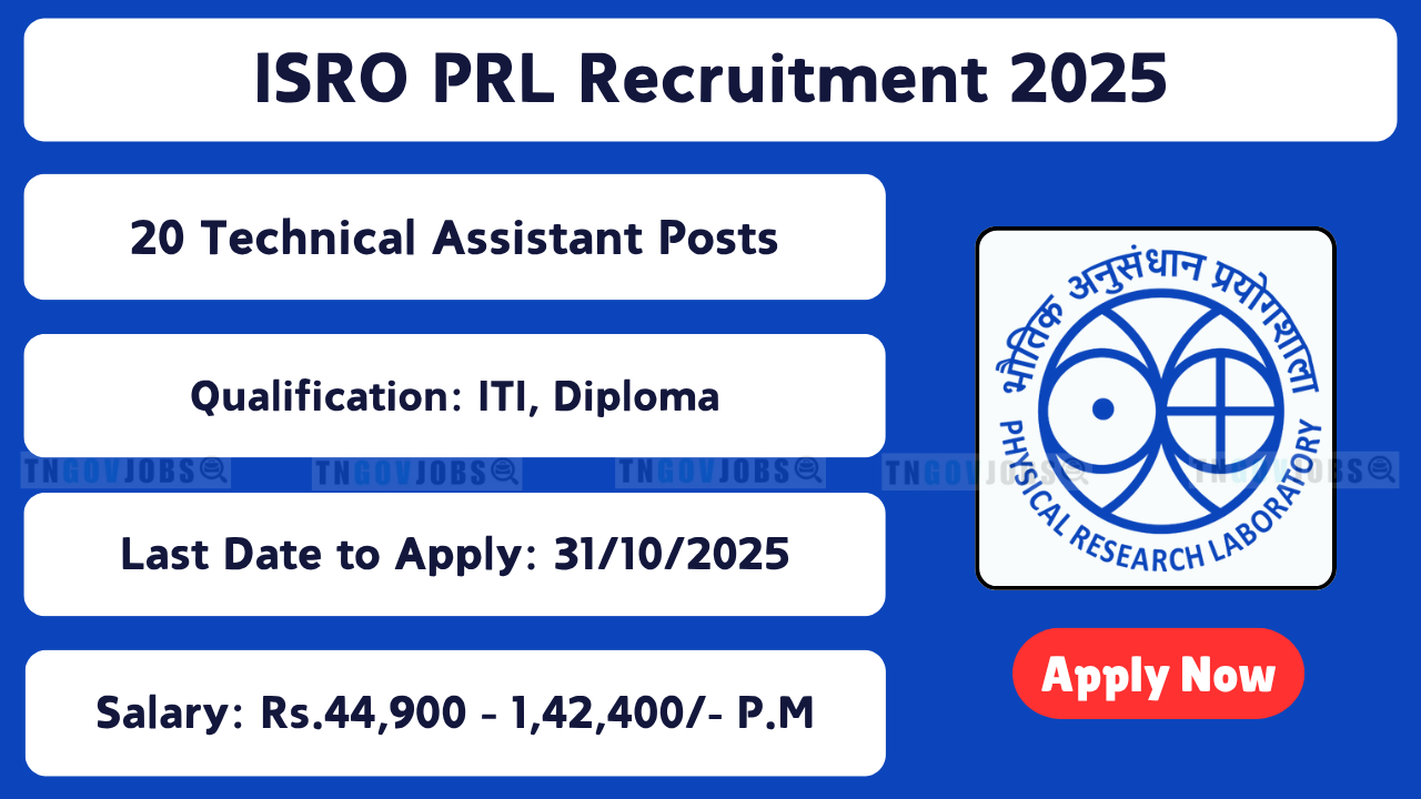 ISRO PRL Recruitment 2025: ISRO – Physical Research Laboratory (PRL) has released Notification No: 02/2025 to fill 20 Technical Assistant and Technician-B posts. The online application facility is available at https://www.prl.res.in/ from 04-10-2025 at 10:00 AM to 31-10-2025 at 11:59 PM. Candidates must carefully read the ISRO PRL Technical Assistant 2025 notification and verify their eligibility before applying. Check the ISRO PRL Notification 2025 for salary and additional benefits like medical insurance, PF, TA/DA, etc. Applicants must maintain a working Email Address and Mobile Number until the ISRO PRL Recruitment 2025 results are announced.