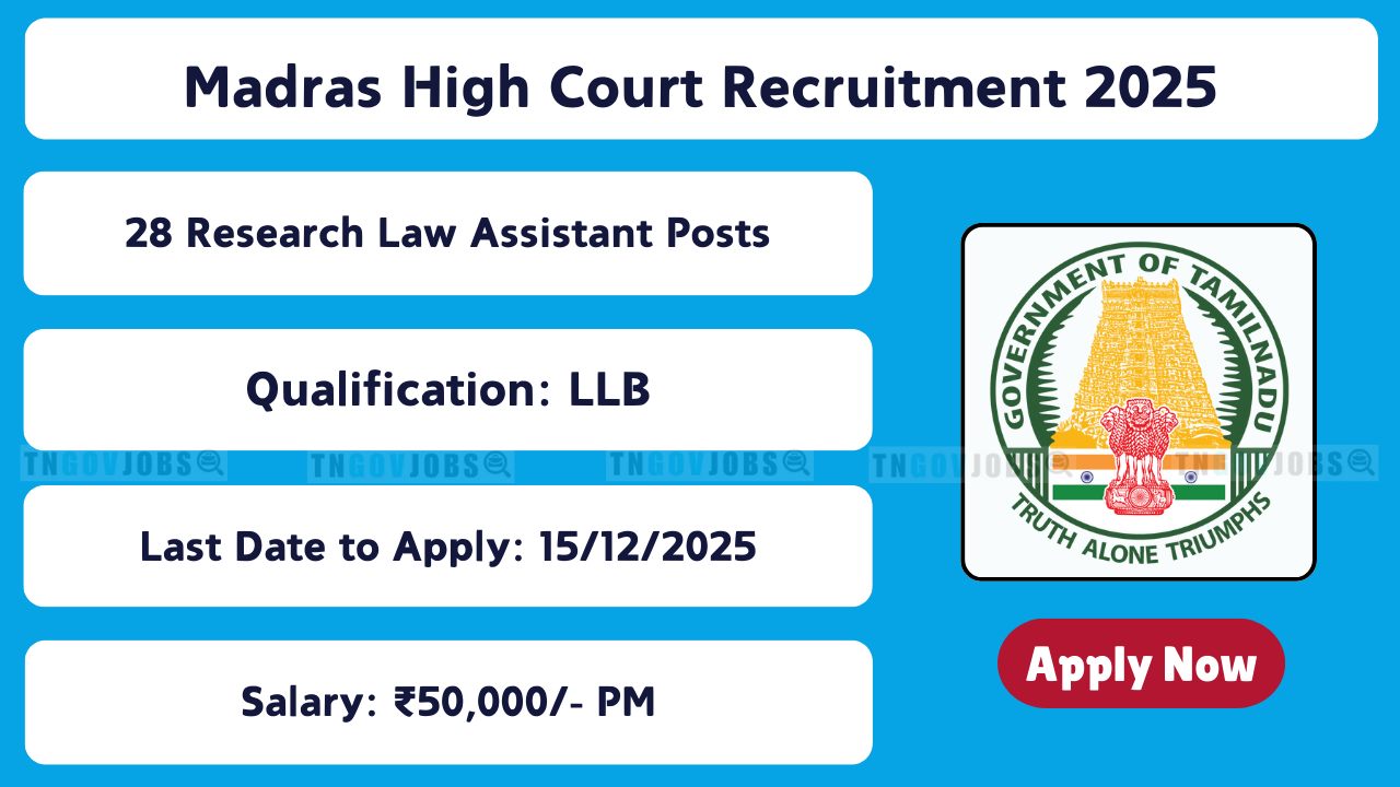 Madras High Court Recruitment 2025: High Court of Madras has released notification for 28 Research Law Assistant Posts in Chennai & Madurai Bench. Apply Offline + Email before 15-12-2025. No Application Fee!