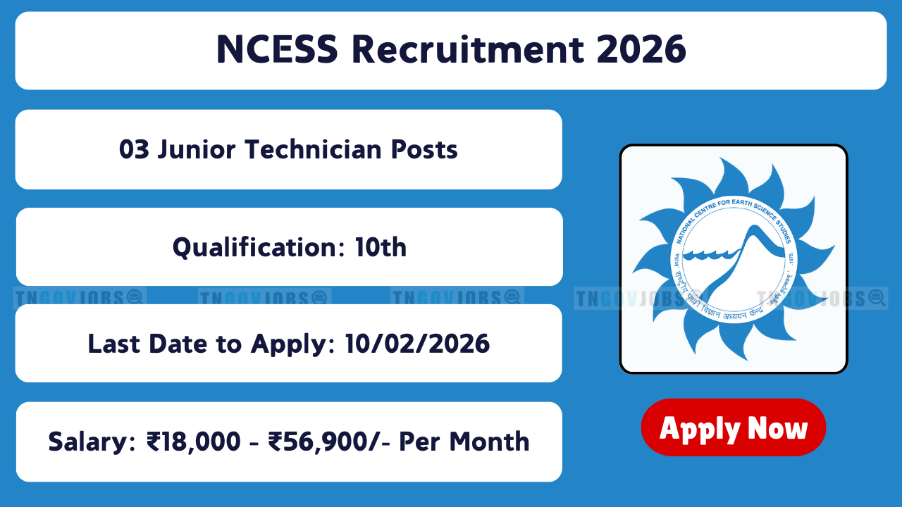 National Centre for Earth Science Studies (NCESS) Recruitment 2026 Notification No: NCESS/P&GA/1224/16/2025 is released! Apply online for 03 Junior Technician vacancies (Post Code 01 & 02) on regular basis. Online facility opens 21 January 2026 (10:00 AM) and closes 10 February 2026 (05:00 PM). Qualification: Matriculation / ITI pass. Age limit 18–30 years (relaxations apply). Pay Level-1 ₹18,000 – ₹56,900. Full eligibility, age, salary & apply process below.