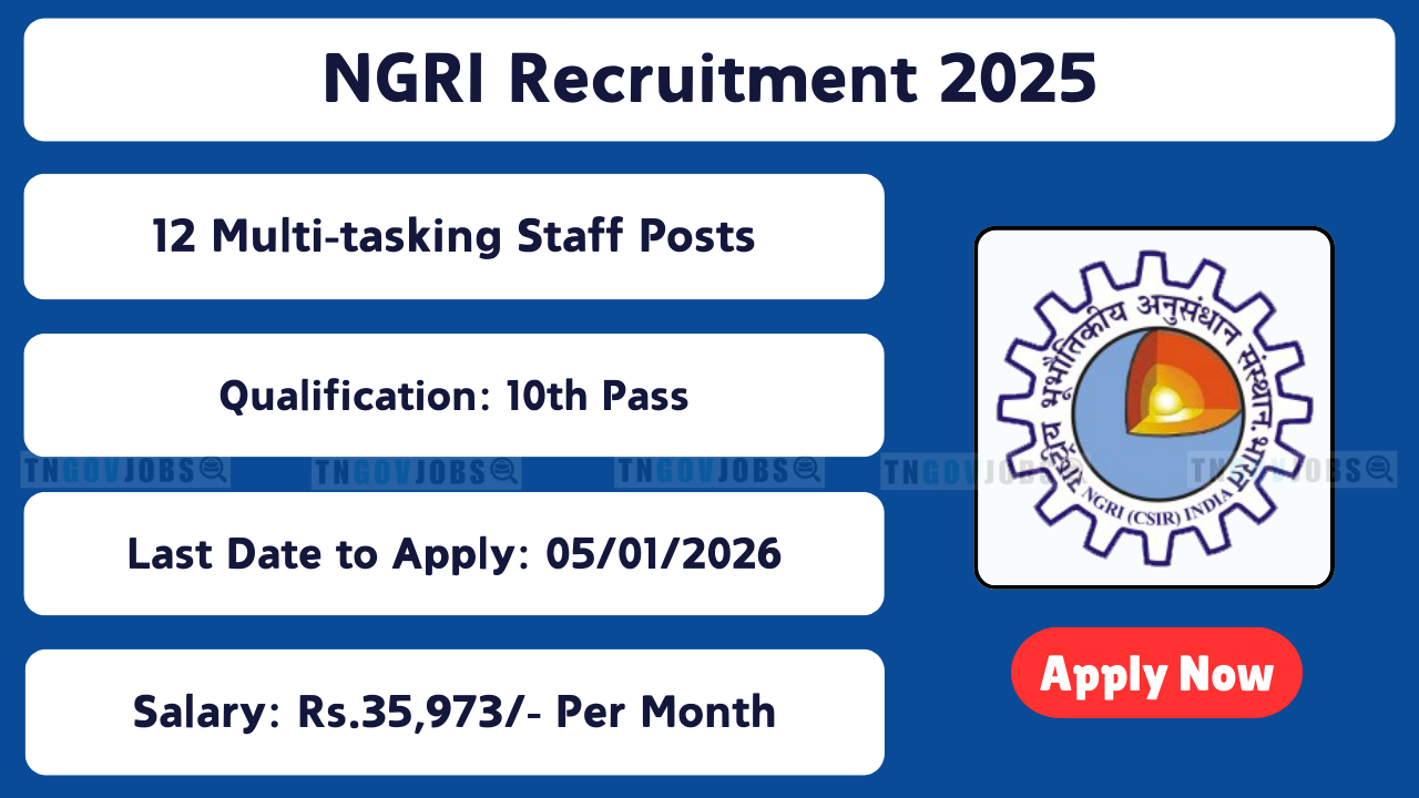 NGRI Recruitment 2025: CSIR – National Geophysical Research Institute (NGRI) has released the recruitment notification No: 06/2025 dated 06.12.2025 to fill the 12 Multi-tasking Staff (MTS) Posts. This online facility will be available on the Official website @ https://www.ngri.res.in/ from 06-12-2025 to 05-01-2026. Before submitting an application, candidates must carefully read the NGRI Multi-tasking Staff 2025 notification and verify their eligibility. Check the NGRI Notification 2025 for salary and additional benefits like medical insurance, PF, TA/DA, etc. Applicants must have a working Email Address and Mobile Number that they maintain until the NGRI Recruitment 2025 results are announced.