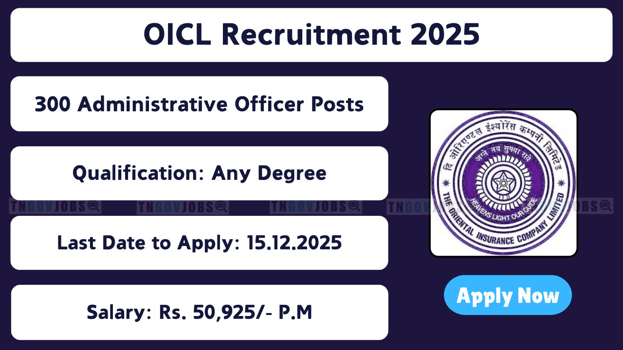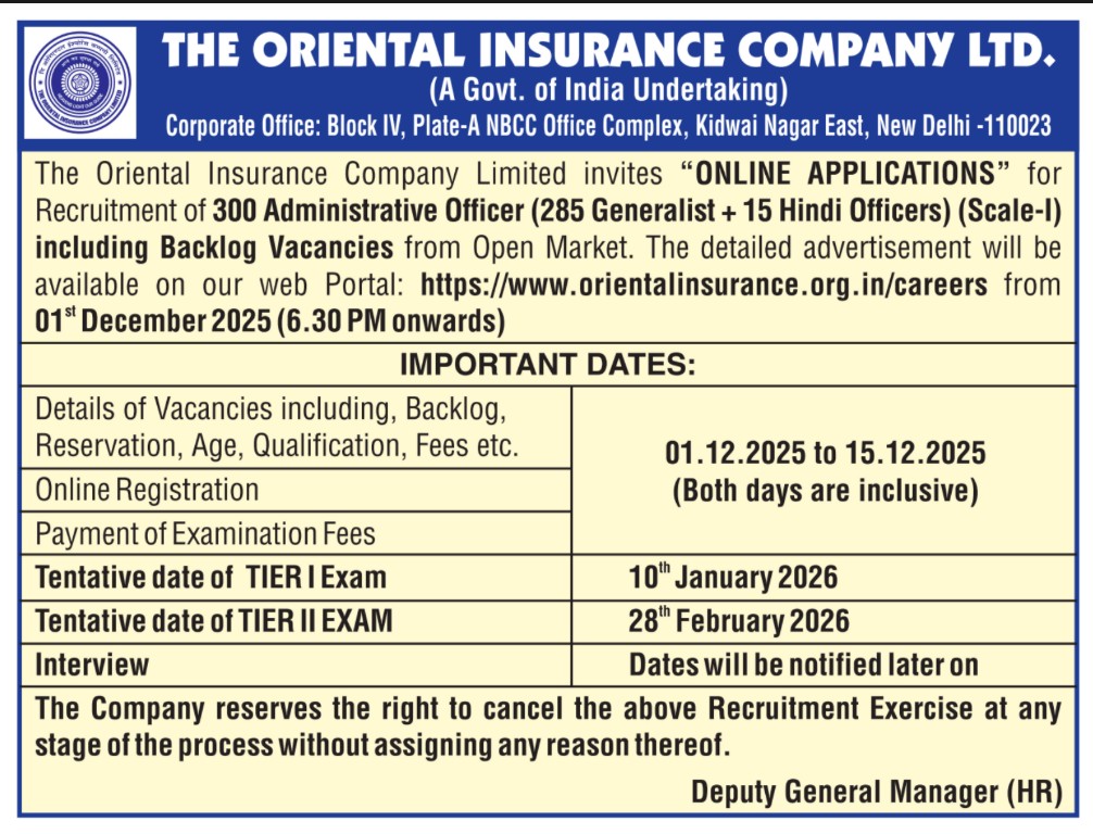 SEO: OICL Recruitment 2025, OICL Administrative Officer Scale I 300 Posts, apply online at orientalinsurance.org.in before 15 December 2025. Check official notification for post-wise eligibility, selection process, salary, age limit and application fee details.