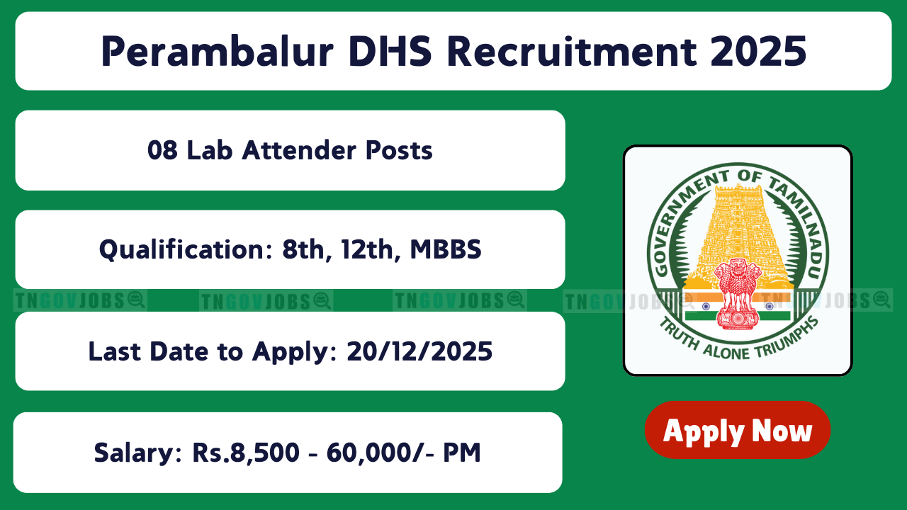 Perambalur DHS Recruitment 2025: District Health Society Perambalur has released notification for 08 Contract Posts (Medical Officer, Lab Attender, Health Inspector, Yoga Therapist, etc.). Apply Offline before 20-12-2025. No Application Fee!