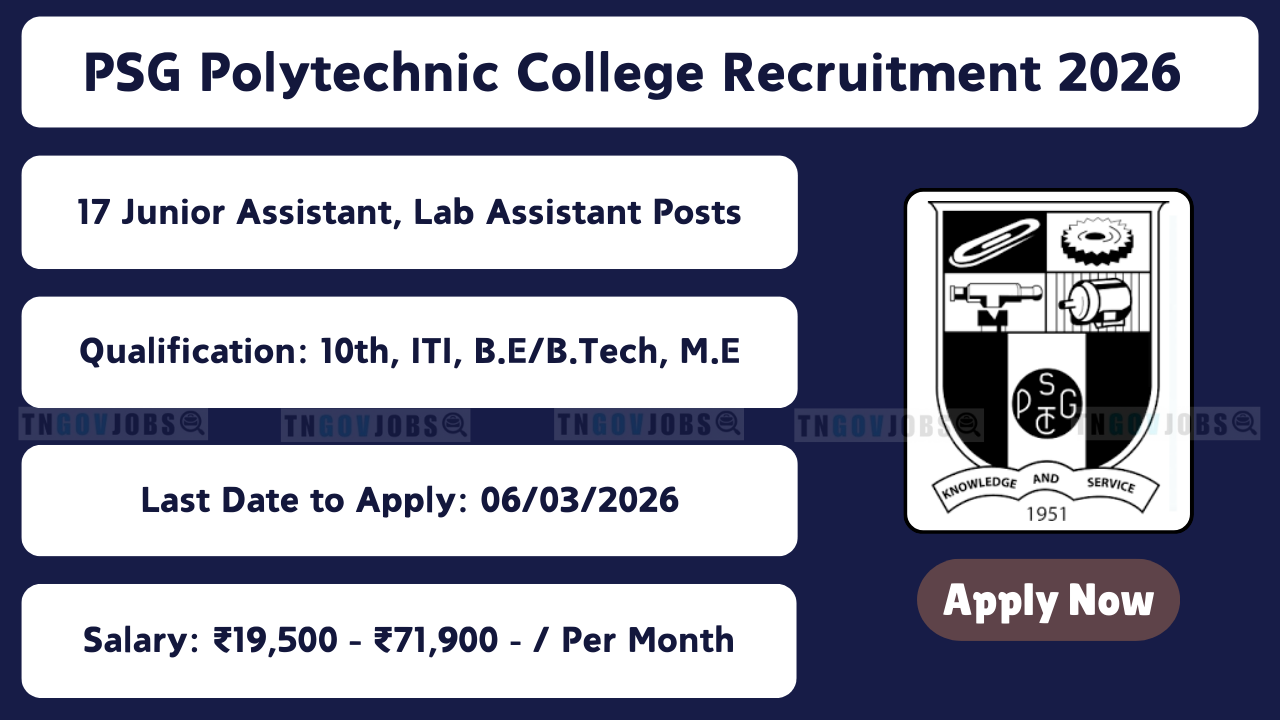 PSG Polytechnic College Recruitment Notification No: N3/SSC/2026 is released! Apply online for 17 vacancies – Junior Assistant (3), Store Keeper (1), Typist (1), Skilled Assistant Grade – II (3), Laboratory Assistant (2), Lecturer (Mechanical, EEE, Design & Drafting, Textile Tech, Mathematics, Physics) (6), Librarian (1). Online registration from 23 February 2026 to 06 March 2026 at psgpolytech.ac.in. Qualification: 10th / ITI / Bachelor’s / Master’s / B.E/B.Tech (post-wise). Age: 18–59 years (post-wise, relaxations apply). Pay: Level 8–10 (₹19,500 – ₹71,900 & ₹57,700). Selection through Shortlisting + Interview / Certificate Verification. Full eligibility & apply process below.