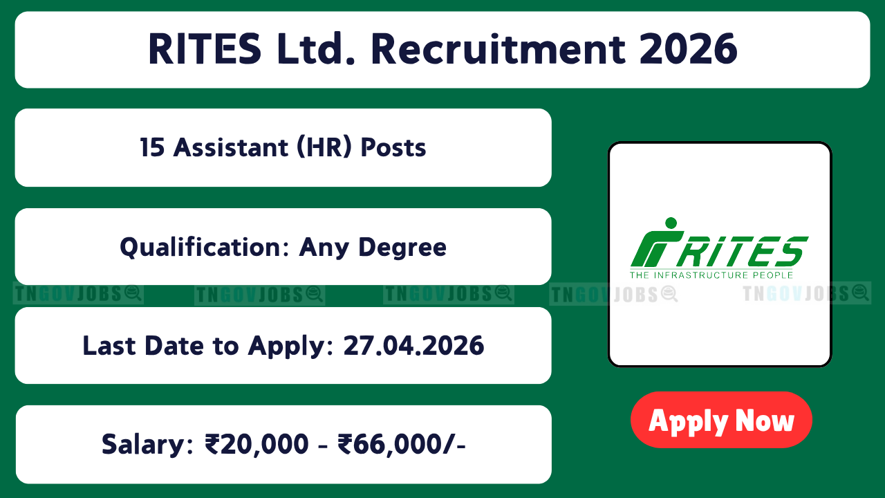 RITES Ltd Recruitment Notification No: RG/07/26 is released! Apply online for 15 Assistant (HR) vacancies. Online registration from 19 March 2026 to 27 April 2026 at rites.com. Qualification: Graduation in any discipline. Age: 30 years (relaxations apply). Pay: ₹20,000 – ₹66,000. Selection through Written Test + Document Verification. Exam center in Tamil Nadu: Chennai. Application fee ₹300 (others), ₹100 (reserved). Full eligibility & apply process below.