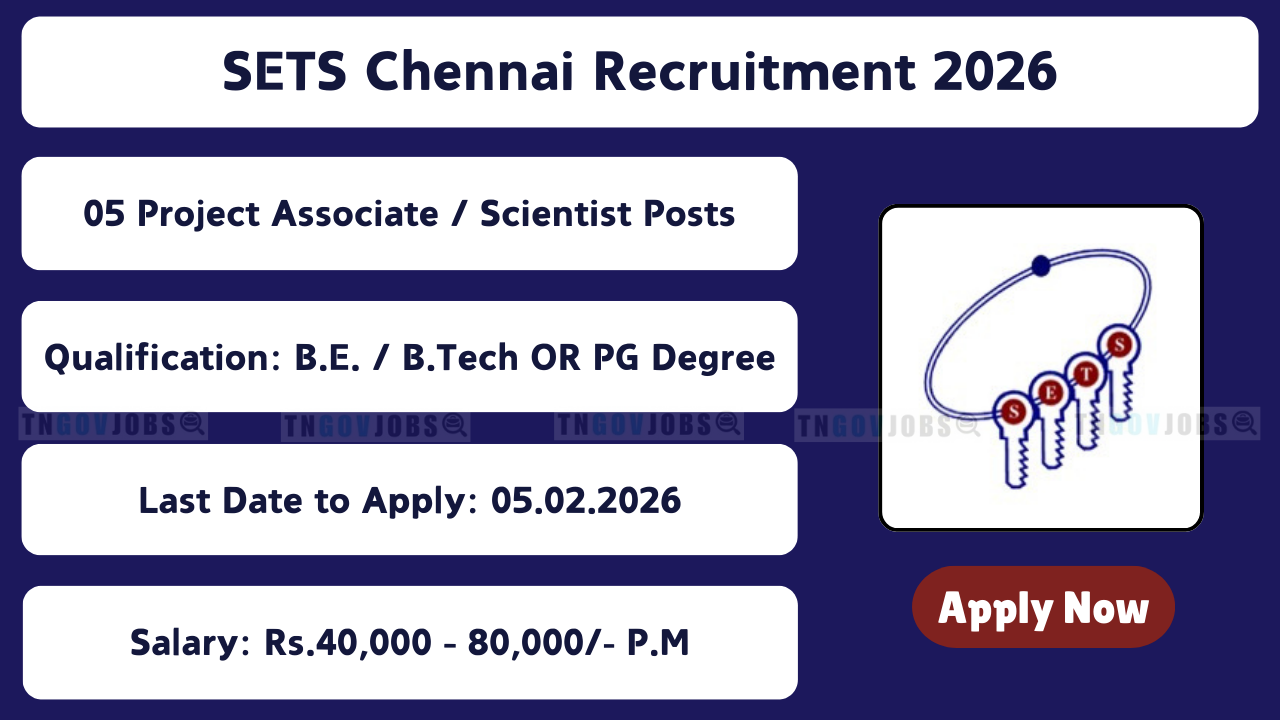 Society for Electronic Transactions and Security (SETS) Chennai Recruitment 2026 is released! Apply online for 05 Project Scientist / Project Associate vacancies in Chennai – Tamil Nadu. Online registration from 22 January 2026 to 05 February 2026. Salary ₹40,000 – ₹80,000 per month. No application fee. Selection through Interview. Full eligibility, age, salary & apply process below.