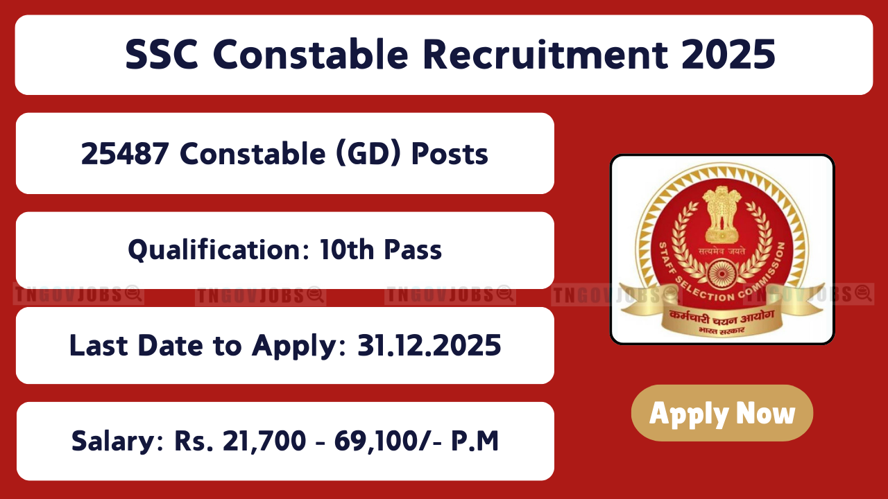 SSC Recruitment 2025: Staff Selection Commission (SSC) has released the recruitment notification No: F. No. HQ-C-3007/10/2025-C-3 to fill the 25487 Constable (GD) in Central Armed Police Forces (CAPFs) and SSF, and Rifleman (GD) in Assam Rifles Examination, 2026 Posts. This online facility will be available on the Official website @ https://ssc.gov.in/ from 01-12-2025 to 31-12-2025. Before submitting an application, candidates must carefully read the SSC Constable (GD) 2025 notification and verify their eligibility. Check the SSC Notification 2025 for salary and additional benefits like medical insurance, PF, TA/DA, etc. Applicants must have a working Email Address and Mobile Number that they maintain until the SSC Recruitment 2025 results are announced.