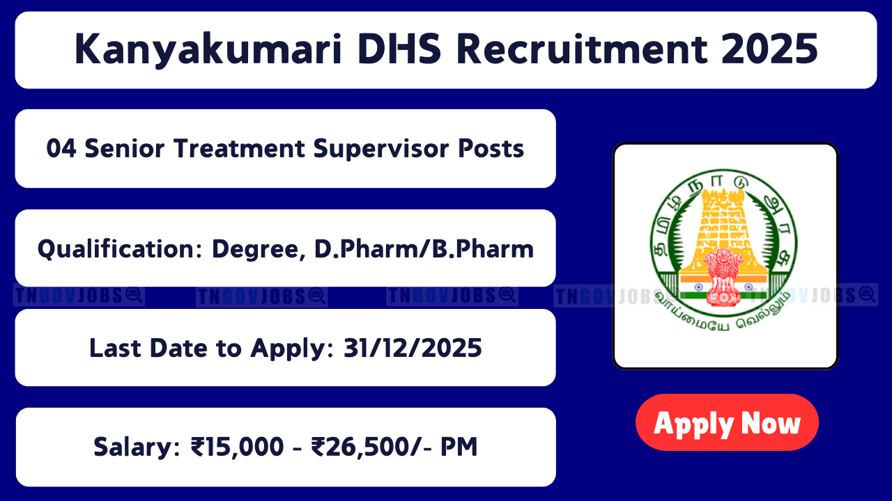 | Kanniyakumari DHS | Medical Officer, Staff Nurses, Health Inspector Grade II, Hospital Worker | 20 | 8th, 12th, DGNM/B.Sc., Nursing, MBBS | 24.03.2025 | Apply Here |