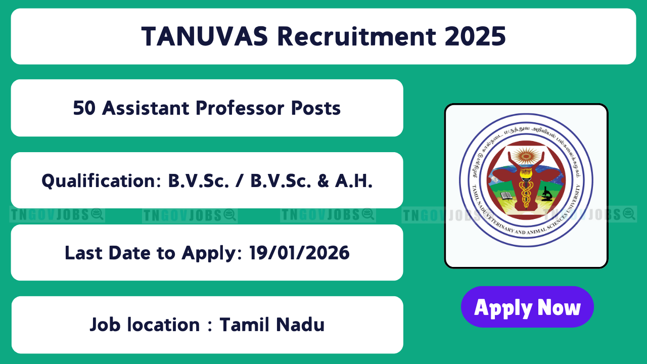 TANUVAS Recruitment 2025: Tamil Nadu Veterinary and Animal Sciences University (TANUVAS) has released Advertisement No. 02/2025 for 50 Assistant Professor Posts (48 Regular + 2 Backlog SC). Apply Offline as per notification. No Application Fee!