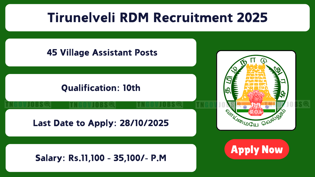 Tirunelveli RDM Village Assistant Recruitment 2025: Tirunelveli Revenue and Disaster Management Department (Tirunelveli RDM) has released a notification at tirunelveli.nic.in for recruitment to the post of Village Assistant in Tirunelveli, Tamil Nadu. A total of 45 vacancies are available across various talukas. Interested candidates can apply offline on or before 28-Oct-2025 (Last Date Extended). Candidates must carefully read the Tirunelveli RDM Village Assistant 2025 notification and verify their eligibility before applying. Check the Tirunelveli RDM Notification 2025 for salary and additional benefits like medical insurance, PF, TA/DA, etc. Applicants must maintain a working Email Address and Mobile Number until the Tirunelveli RDM Recruitment 2025 results are announced.
