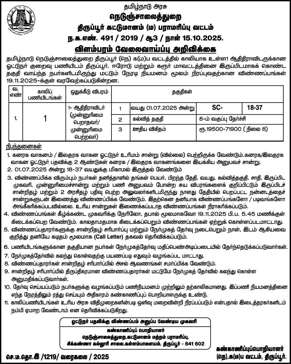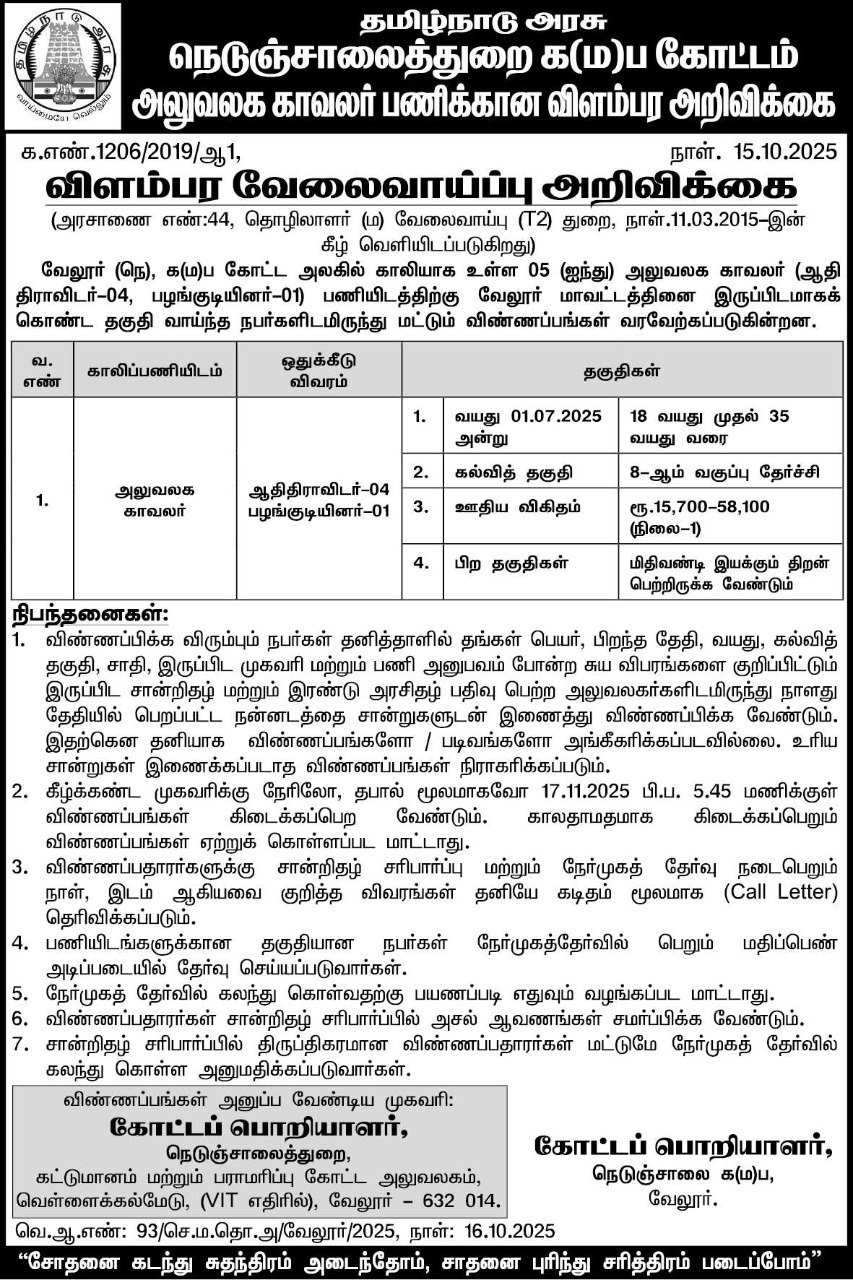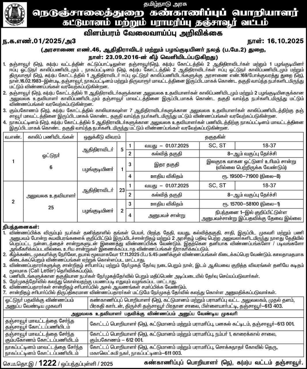 TN Highways Department Recruitment 2025: Tamil Nadu Highways Department has released the recruitment notification to fill the 84 Office Assistant, Driver & Watchman Posts. The application form should be downloaded in PDF format from the Official website @ https://www.tnhighways.tn.gov.in/. Before submitting an application, candidates must carefully read the TN Highways Department 2025 notification and verify their eligibility. Applicants must have a working Email Address and Mobile Number that they maintain until the results are announced.