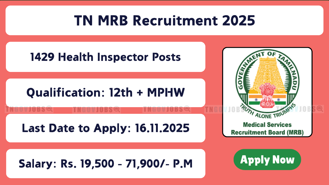 TN MRB Recruitment 2025: Tamilnadu Medical Services Recruitment Board (TN MRB) has released the recruitment notification No: 16/MRB/2025 Dated 27.10.2025 to fill 1429 Health Inspector Grade-II Posts. This online facility will be available on the official website https://www.mrb.tn.gov.in/ from 27-10-2025 to 16-11-2025. Before submitting an application, candidates must carefully read the TN MRB Health Inspector Grade-II 2025 notification and verify their eligibility. Check the TN MRB Notification 2025 for salary and additional benefits like medical insurance, PF, TA/DA, etc. Applicants must have a working Email Address and Mobile Number that they maintain until the TN MRB Recruitment 2025 results are announced.
