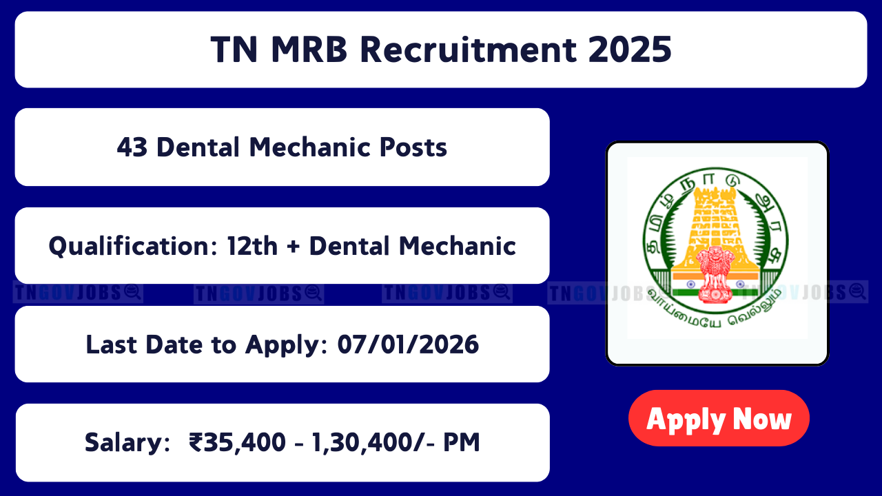 TN MRB Recruitment 2025: Medical Services Recruitment Board (MRB), Tamil Nadu has released notification No: 21/MRB/2025 for 43 Dental Mechanic Posts. Apply Online before 07-01-2026. Fee ₹300–₹600!