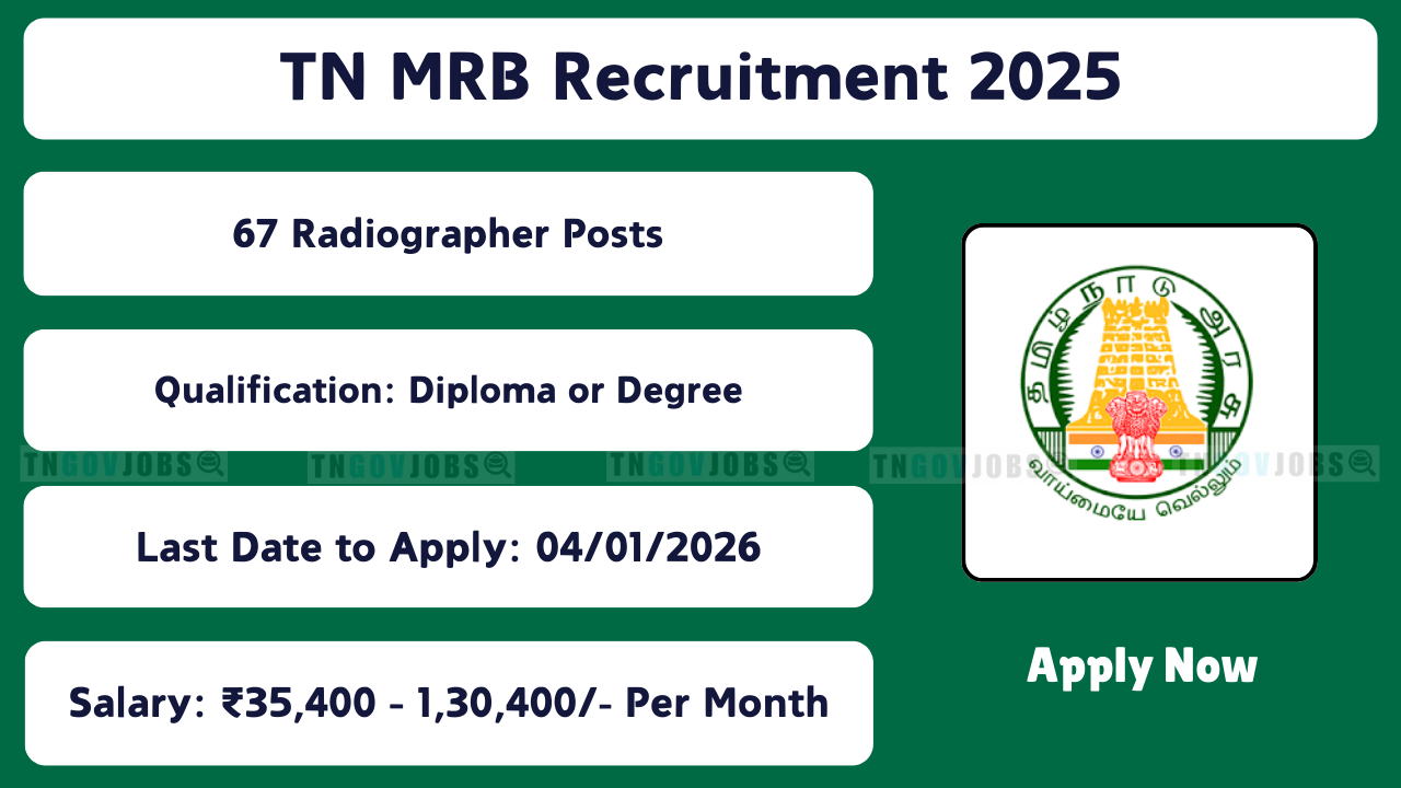 TN MRB Recruitment 2025: Tamil Nadu Medical Services Recruitment Board (TN MRB) has released notification No: 20/MRB/2025 dated 15.12.2025 for 67 Radiographer Posts. Apply Online before 04-01-2026. Fee ₹300–₹600!
