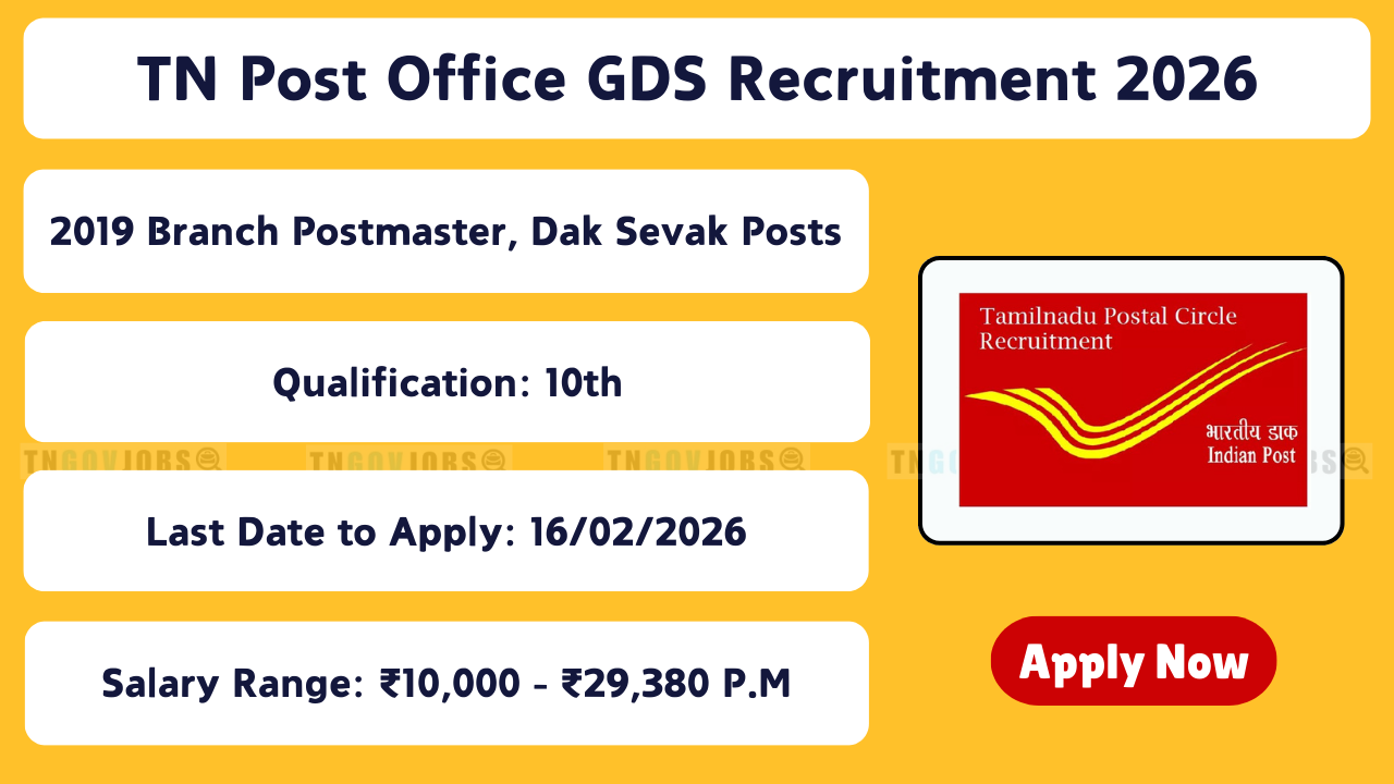 Tamil Nadu Postal Circle GDS Recruitment 2026 Notification No: 17-37/2025-GDS (Pt.I) is released! Apply online for 2019 Gramin Dak Sevak vacancies (BPM / ABPM / Dak Sevak) in Tamil Nadu. Online One-Time Registration: 31 Jan – 14 Feb 2026. Application submission: 02 Feb 2026 to 16 Feb 2026 at indiapost.gov.in/gdsonlineengagement. Qualification: 10th pass + local language studied up to 10th + basic computer knowledge. Age: 18–40 years (relaxations apply). Pay: ₹10,000 – ₹29,380. Application fee ₹100 / Nil (reserved). Full division-wise vacancy, eligibility & apply process below.