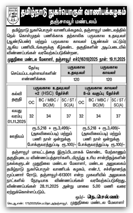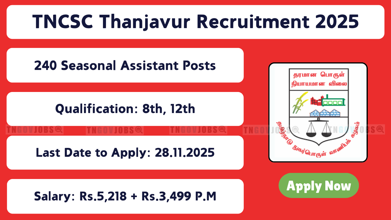 TNCSC Recruitment 2025: Tamil Nadu Civil Supplies Corporation (TNCSC) has released the recruitment notification to fill 240 Seasonal Assistant & Seasonal Watchman posts. Download the application form from the official website tncsc.tn.gov.in. The last date for receipt of filled applications is 28-11-2025 (05:00 PM). Candidates must carefully read the TNCSC notification and verify eligibility before applying.
