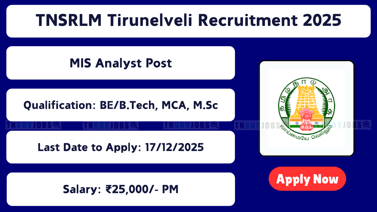 TNSRLM Tirunelveli Recruitment 2025: Tamil Nadu State Rural Livelihood Mission (TNSRLM) Tirunelveli has released notification for MIS Analyst posts on contract basis. Apply Online/Offline before 17-12-2025. No Application Fee!