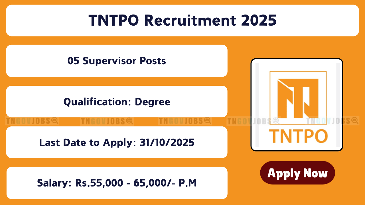 TNTPO Recruitment 2025: Tamilnadu Trade Promotion Organisation has released the recruitment notification to fill the 05 Admin Supervisor, MEP Maintenance Supervisor, Accounts Supervisor, Marketing Supervisor, Hall Supervisor Posts. This online facility will be available on the Official website @ https://www.chennaitradecentre.in/ from 27-10-2025 to 31-10-2025 at 04.00 PM. Before submitting an application, candidates must carefully read the TNTPO Supervisor 2025 notification and verify their eligibility. Check the TNTPO Notification 2025 for salary and additional benefits like medical insurance, PF, TA/DA, etc. Applicants must have a working Email Address and Mobile Number that they maintain until the TNTPO Recruitment 2025 results are announced.