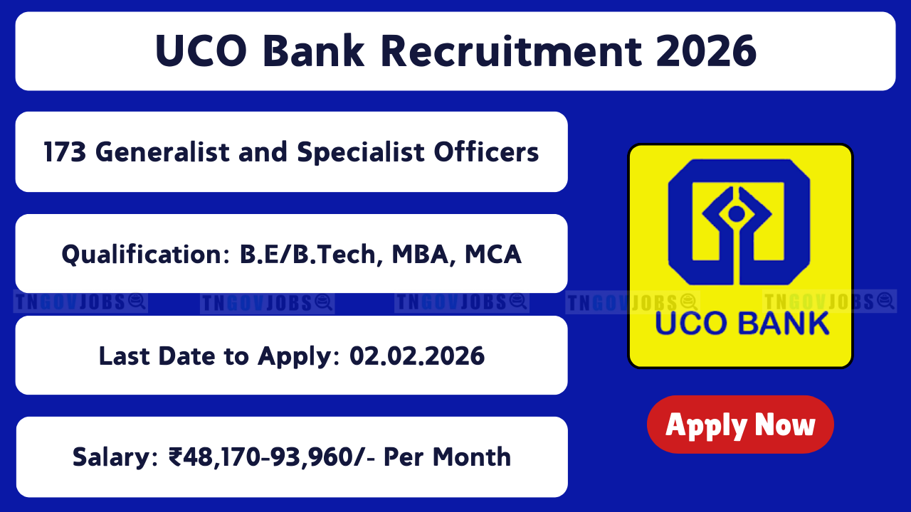 UCO Bank Recruitment 2026: UCO Bank has released Notification No: HO/HRM/RECR/2025-26/COM-04 for 173 Generalist & Specialist Officer Posts (JMGS-I & MMGS-II). Apply Online from 13-01-2026 to 02-02-2026. Fee ₹175–₹800!