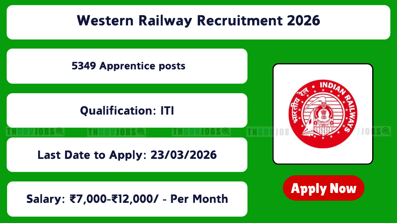 Western Railway Recruitment Cell (RRC/WR) Notification No: RRC/WR/04/2025 is released! Apply online for 5349 Apprentice vacancies under Apprentices Act 1961 in various trades (Fitter, Welder, Turner, Machinist, Carpenter, Painter, Diesel Mechanic, Mechanic Motor Vehicle, COPA, Electrician, Electronics Mechanic, Wireman, Mechanic Refrigeration & AC, Pipe Fitter, Plumber, Draftsman Civil, Stenographer English, Forger & Heat Treater, Machinist Grinder). Online registration from 21 February 2026 to 23 March 2026 at rrc-wr.com. Qualification: 10th + ITI in relevant trade (NCVT/SCVT) with 50% marks. Age: 15–24 years (relaxations apply). Stipend as per Apprenticeship Rules. Selection through Merit List + Certificate Verification. Full eligibility & apply process below.