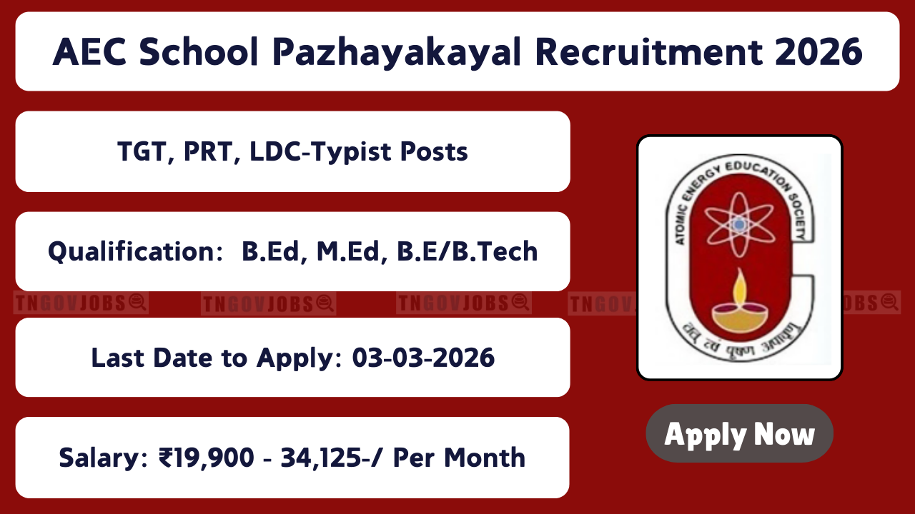 Atomic Energy Central School (AECS) Pazhayakayal Recruitment 2026 invites offline applications for TGT, PRT, Balvatika Teacher & LDC-Typist vacancies. Last date for receipt of filled applications: 03 March 2026 (between 09:30 AM – 02:00 PM on working days). Qualification: 12th / Bachelor’s / Post Graduate (post-wise). Age: 18–65 years (TGT/PRT/Balvatika) & 18–27 years (LDC-Typist). Selection through Shortlisting + Skill Test / Interview. Full post-wise eligibility & apply process below.