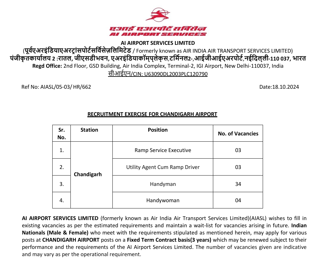 AIASL Chandigarh Recruitment 2024: AI AIRPORT SERVICES LIMITED (formerly known as Air India Air Transport Services Limited) (AIASL) wishes to fill in existing vacancies as per the estimated requirements and maintain a wait-list for vacancies arising in future. Indian Nationals (Male & Female) who meet with the requirements stipulated as mentioned herein may apply for various posts at CHANDIGARH AIRPORT posts on a Fixed Term Contract basis (3 years) which may be renewed subject to their performance and the requirements of the AI Airport Services Limited. Eligible candidates can apply offline on or before 30.10.2024.