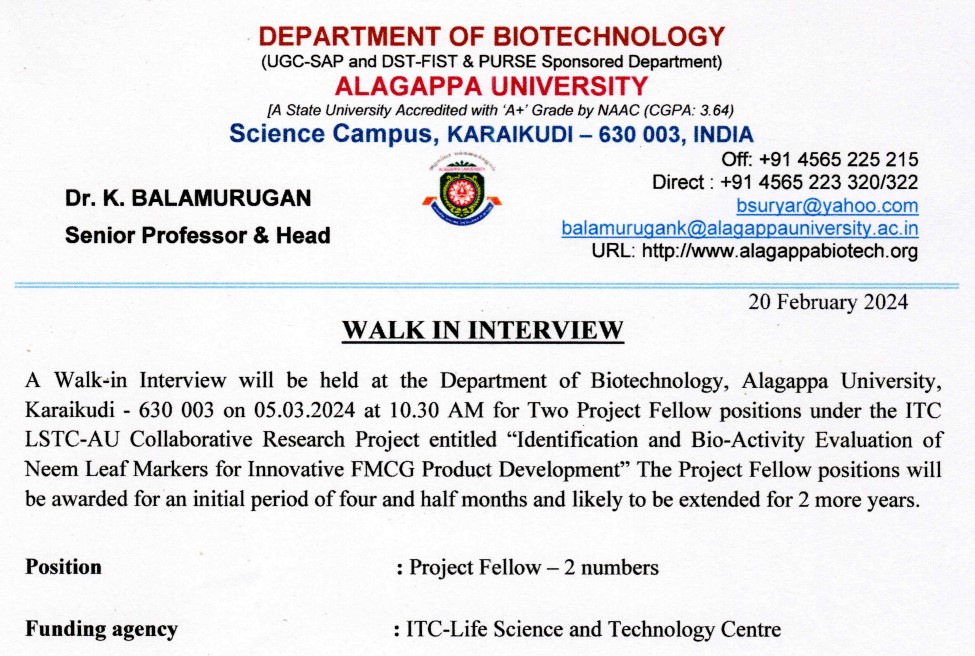 • Candidates appearing for the Walk-in Interview shall bring CV, copies of certificates and all original certificates/ testimonials for verification. An advance copy of the CV may be sent by email to: balamurugank@alagappauniversity.ac.in. No TA/DA will be paid for attending the interview.