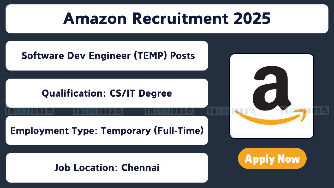 Amazon Recruitment 2025: Amazon Development Centre (India) has released the recruitment notification for Software Dev Engineer (TEMP) posts. This is a full-time temporary role at ADCI MAA 15 SEZ (Chennai). Freshers currently pursuing B.E/B.Tech are eligible. Applications are reviewed on a rolling basis through the official Amazon Jobs portal. Apply before the opportunity closes!