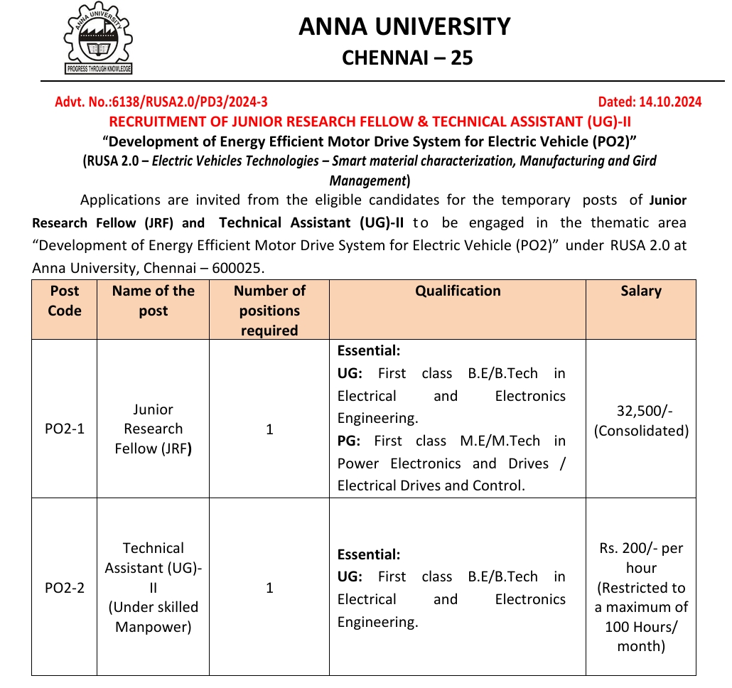Anna University Recruitment 2024 : Applications are invited from the eligible candidates for the temporary posts of Junior Research Fellow (JRF) and Technical Assistant (UG)-II to be engaged in the thematic area “Development of Energy Efficient Motor Drive System for Electric Vehicle (PO2)” under RUSA 2.0 at Anna University, Chennai – 600025. Eligible candidates can apply Offline on or before 04.11.2024.