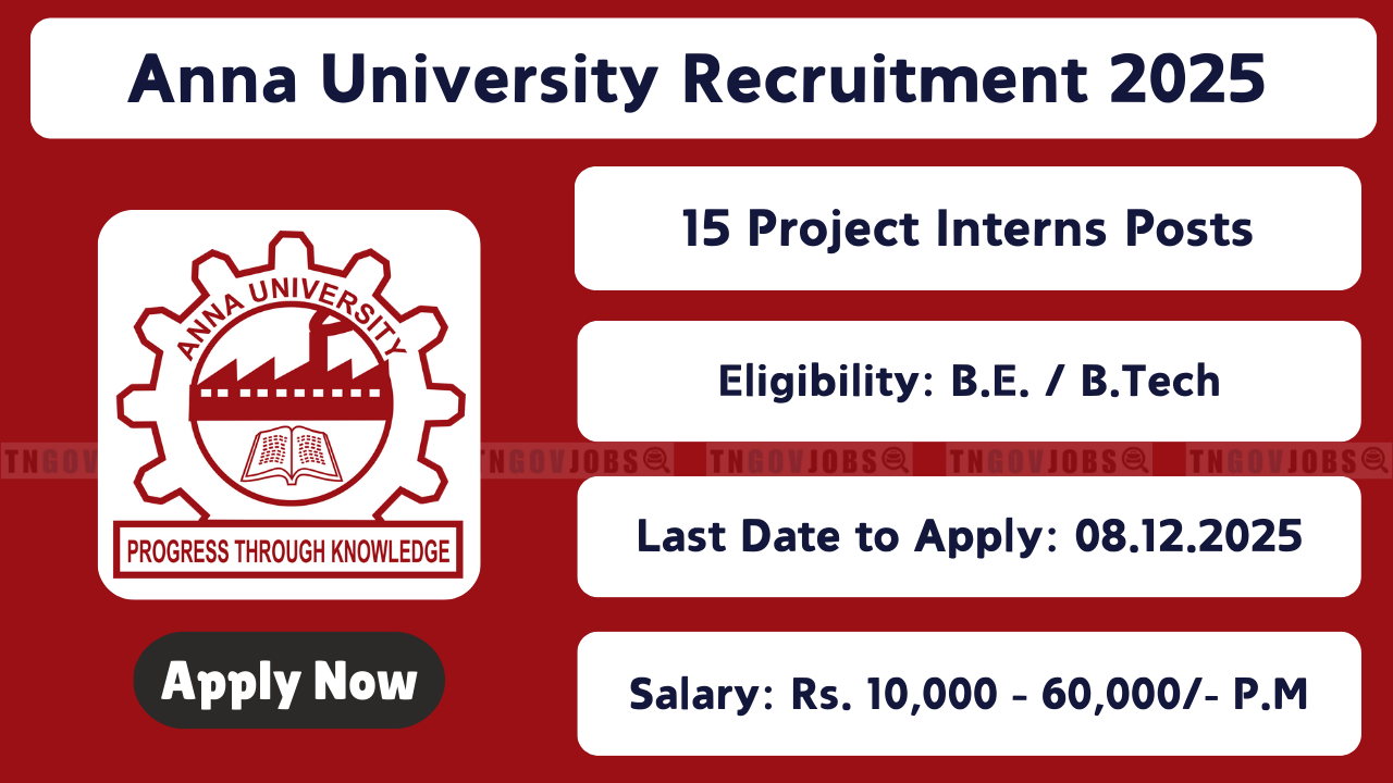 SEO: Anna University Recruitment 2025, Anna University Project Associate II 2025, Anna University Project Interns 2025, 15 Vacancies, apply by 08 Dec 2025 at annauniv.edu. Check official notification for post-wise eligibility, pay scale, selection process and how to apply.