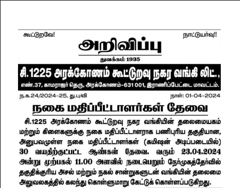 A Willing and Eligible candidates bring the CV, copies of relevant certificates and proof for experience/publications & attend the walk-in-interview At Venue : Arakkonam Co-operative Urban Bank, No: 37 Kamarajar Street, Arakkonam, Ranipet-631001.
