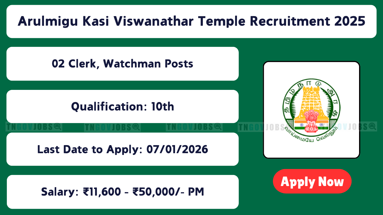 Arulmigu Kasi Viswanathar Temple Recruitment 2026: Parangimalai, Arulmigu Kasi Viswanathar Temple has released notification for 02 Posts (Clerk, Watchman) on regular basis. Apply Offline before 07-01-2026. No Application Fee!