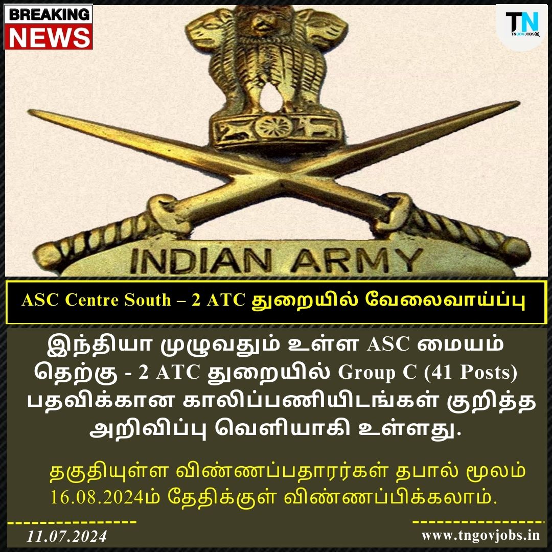 ASC Centre South – 2 ATC Recruitment 2024 : ASC Centre (South) – 2 ATC invites Offline Application for Recruitment to the Post of Civilian Catering Instructor (CCI), Cleaner, Cook, MTS (Chowkidar), Fire Engine Driver, Civilian Motor Driver (OG), Tradesman Mate (Labour) in All Over India. Eligible candidates can Apply Offline on or Before 16.08.2024.