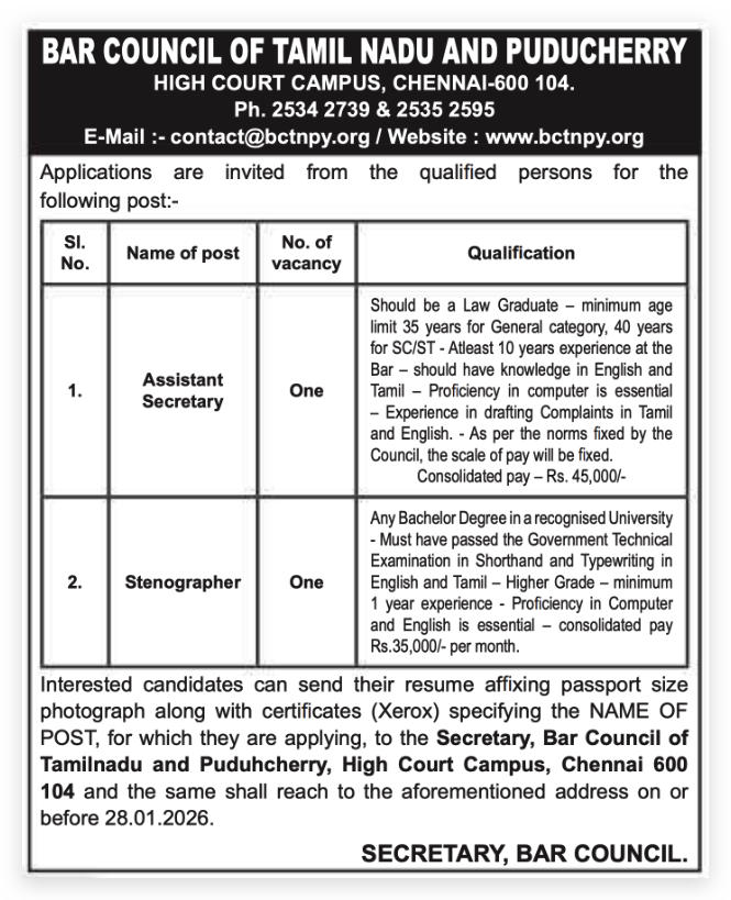 Bar Council of Tamil Nadu & Puducherry Recruitment 2026: Bar Council of Tamil Nadu and Puducherry has released notification for 02 Assistant Secretary & Stenographer Posts. Apply Offline before 28-01-2026. No Application Fee!